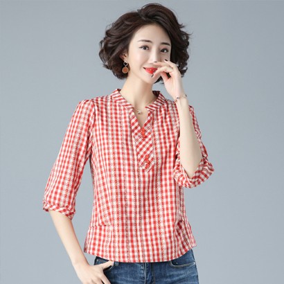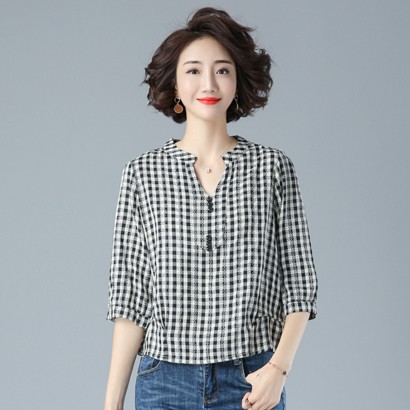 棉麻格子七分袖上衣