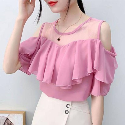 露肩蕾絲雪紡衫