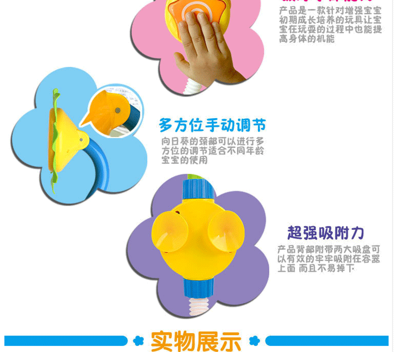 挺可愛的,花灑頭可以輕度調節,吸盤吸力也還蠻强的。水不是很大,還是很溫和的,小朋友很喜歡。比較了幾家店,價格還是比較實惠的,做工也還不錯,玩具表面挺滑的,沒有毛刺之類的。很滿意