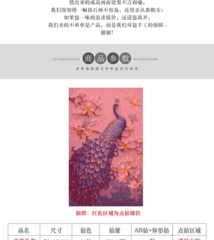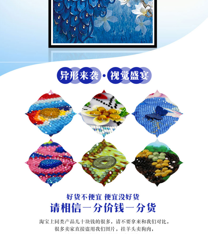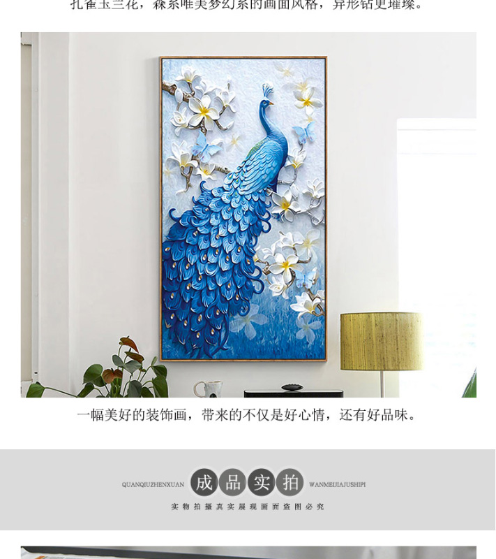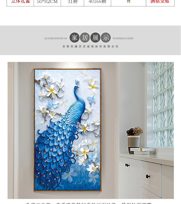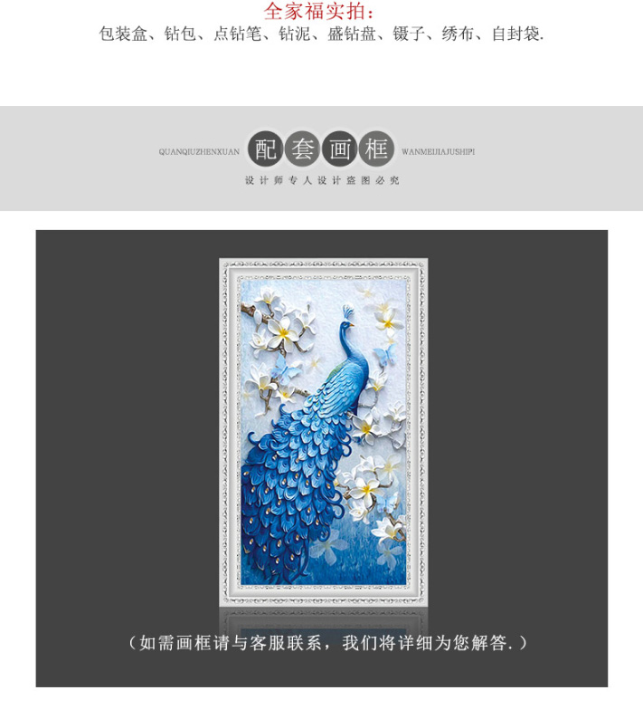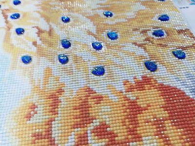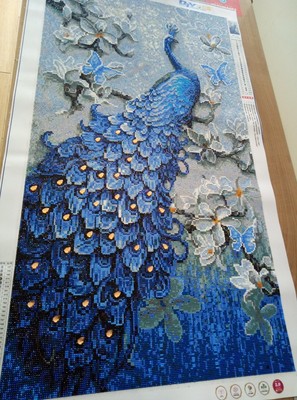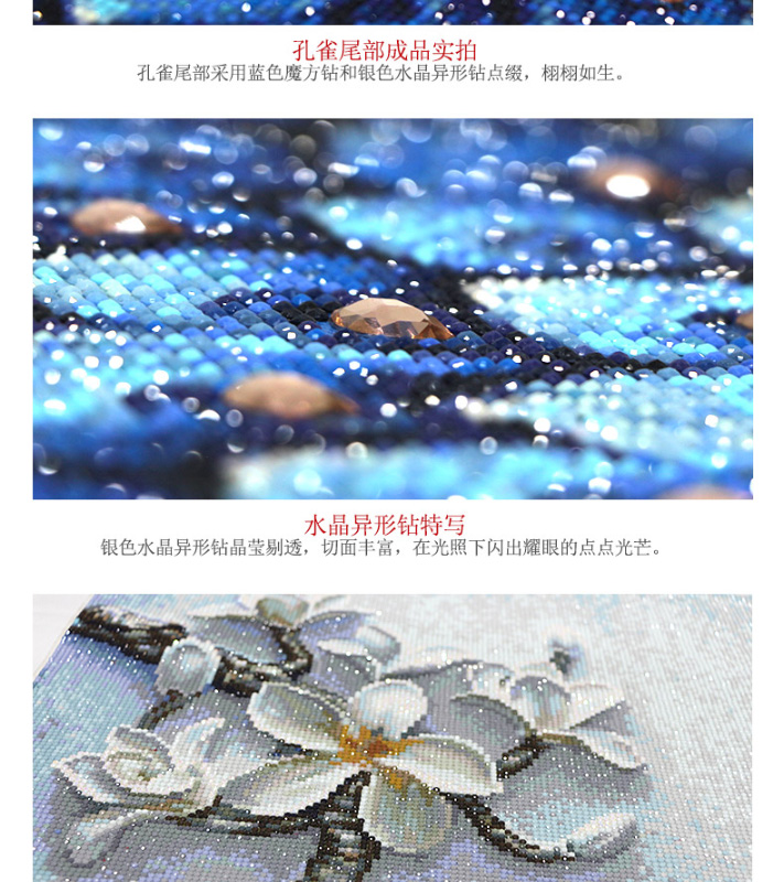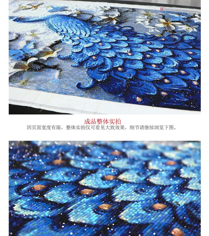 鉆石畫特別的漂亮,很飽滿,很立體,孔雀栩栩如生呢,大鉆很晶瑩剔透,鉆石貼好不會掉,粘的特別牢固,圖案我很滿意